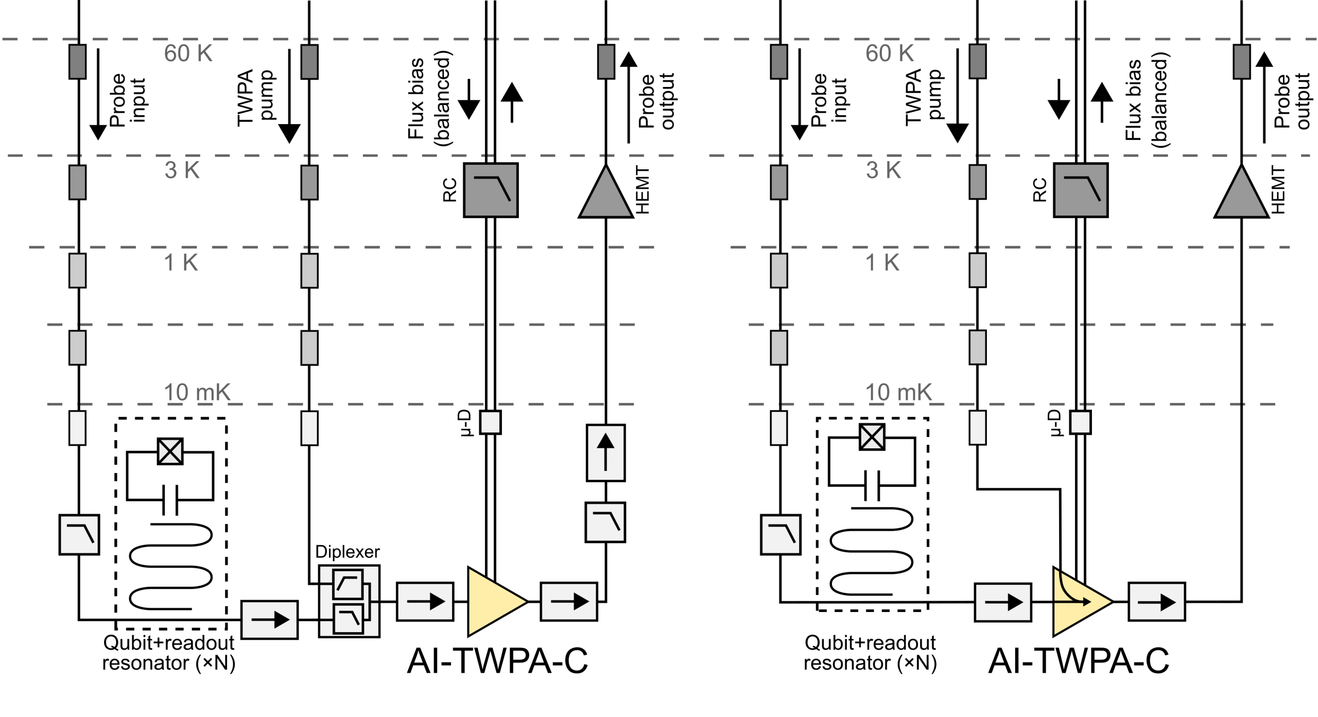Let’s look at the impact of the product revision from a practical engineering perspective and to understand how adopting our technology will improve the day-to-day life of your business or research group. In particular, let’s compare the wiring diagram for our revised AI-TWPA-C with the conventional solution that uses an external coupler: